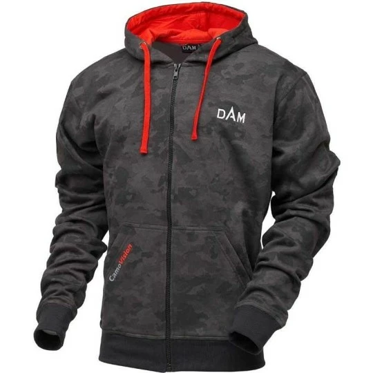 Deze casual hoodie met ritssluiting van DAM kan je perfect dragen in je vrije tijd als tijdens het vissen. Veel draagcomfort dankzij de zachte fleece binnenvoering en brede elastische manchetten. Ook de capuchon met trekkoorden heeft een zachte binnenvoering. Aan de voorzijde zitten handige kangoeroezakken. Je kan deze hoodie snel aan- en uittrekken dankzij de ritssluiting aan de voorzijde. Uitgevoerd in stoere CamoVision print in zwart en grijs.